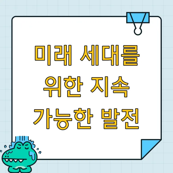 지속 가능한 발전. 단순히 유행어처럼 흘려들을 수 없는, 우리 모두의 미래가 걸린 중대한 과제입니다. 특히 앞으로 이 지구에서 살아갈 미래 세대에게는 더더욱 그렇습니다. 우리가 누리는 풍요와 편리함이 미래 세대의 삶의 터전을 훼손하는 칼이 된다면?! 상상만 해도 끔찍하지 않나요?😱 그렇기에 지속 가능한 발전은 선택이 아닌 필수입니다. 지금 우리의 작은 행동 하나하나가 미래 세대의 삶에 지대한 영향을 미친다는 사실을 명심해야 합니다.